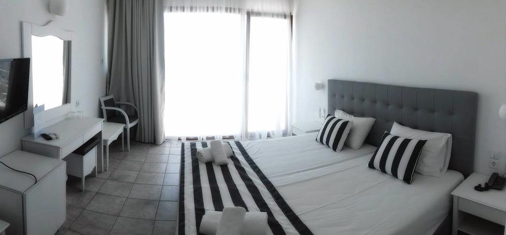 Δίκλινα, τετράκλινα, superior, junior suites, όλα εξοπλισμένα με κλιματισμό, ψυγείο, στεγνωτήρες μαλλιών, μουσική, δορυφορική τηλεόραση, μπαλκόνια ή βεράντες.