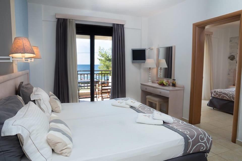 Διαμονή: 7 Διαμερίσματα με καθιστικό, υπνοδωμάτιο, WC και δυνατότητα φιλοξενίας 5 ατόμων 3 Διαμερίσματα με 2 υπνοδωμάτια, WC και δυνατότητα φιλοξενίας 5 ατόμων 19 δωμάτια με WC και δυνατότητα φιλοξενίας έως και 4 άτομα. Όλα μας τα δωμάτια είναι ευρύχωρα με μεγάλο μπαλκόνι και υπέροχη θέα στη θάλασσα, περιέχουν τηλεόραση LCD, κλιματιστικό, ψυγείο και ατομικό βραστήρα.