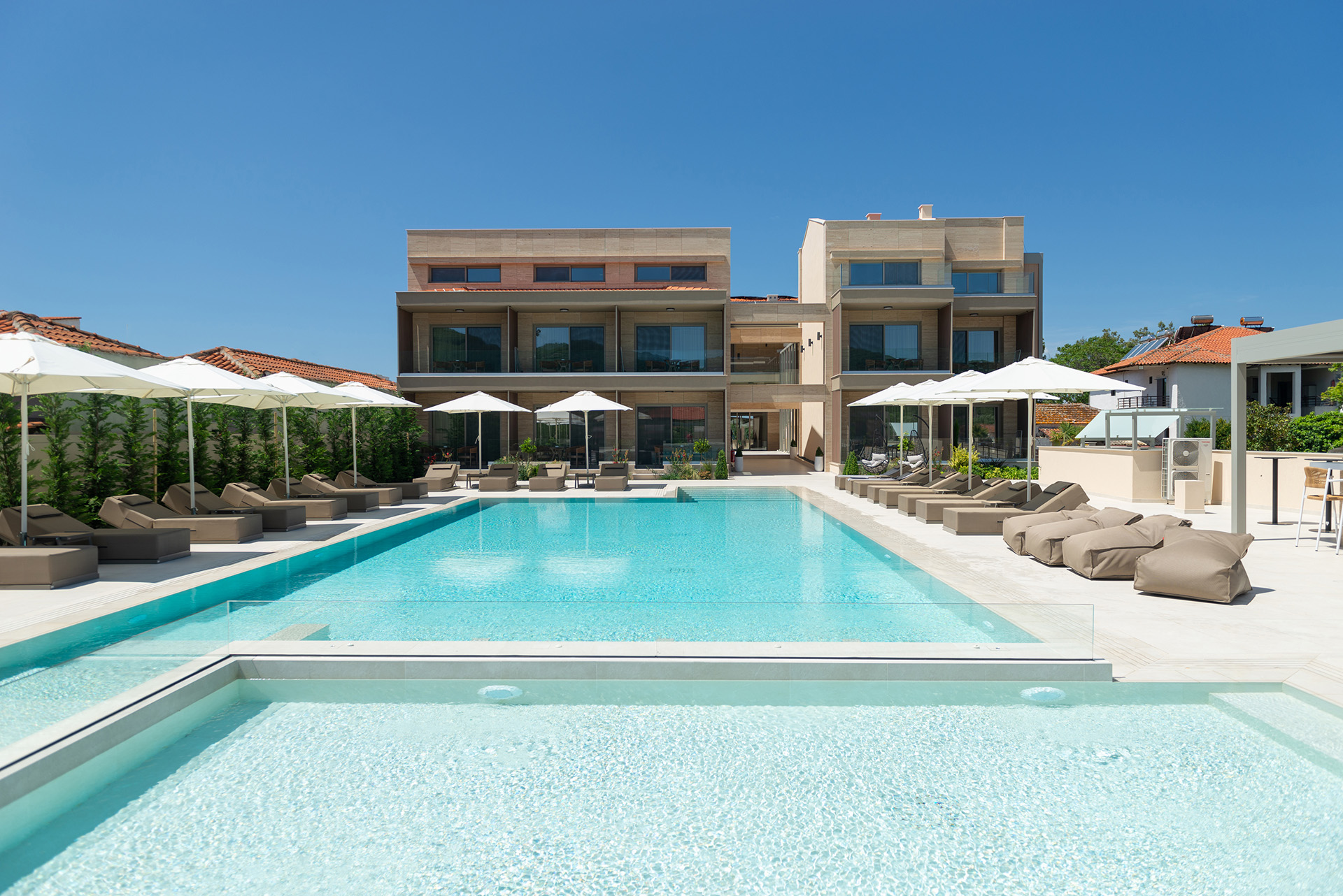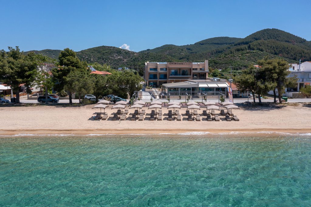Oniro Hotel - where luxury meets the serene beauty of Halkidiki's seafront. Immerse yourself in an exclusive getaway at our boutique four-star hotel, boasting a selection of finely appointed rooms with breathtaking sea and pool views, and indulge in the finest fish and Mediterranean flavors at our seaside tavern. Here, every detail is crafted for your ultimate comfort and pleasure, offering a sanctuary of relaxation and exquisite experiences. Discover a haven where unforgettable memories are made, right on the first line of the beach.